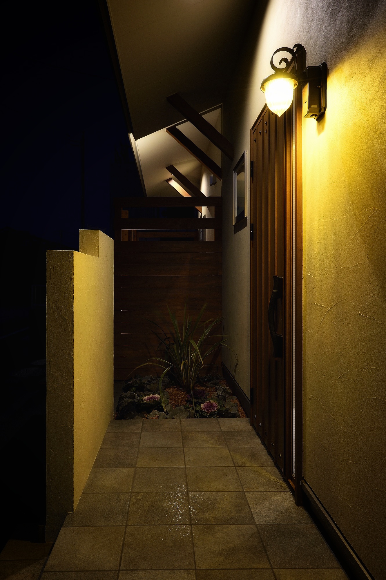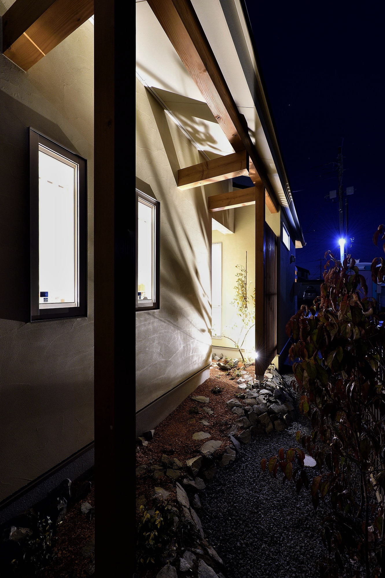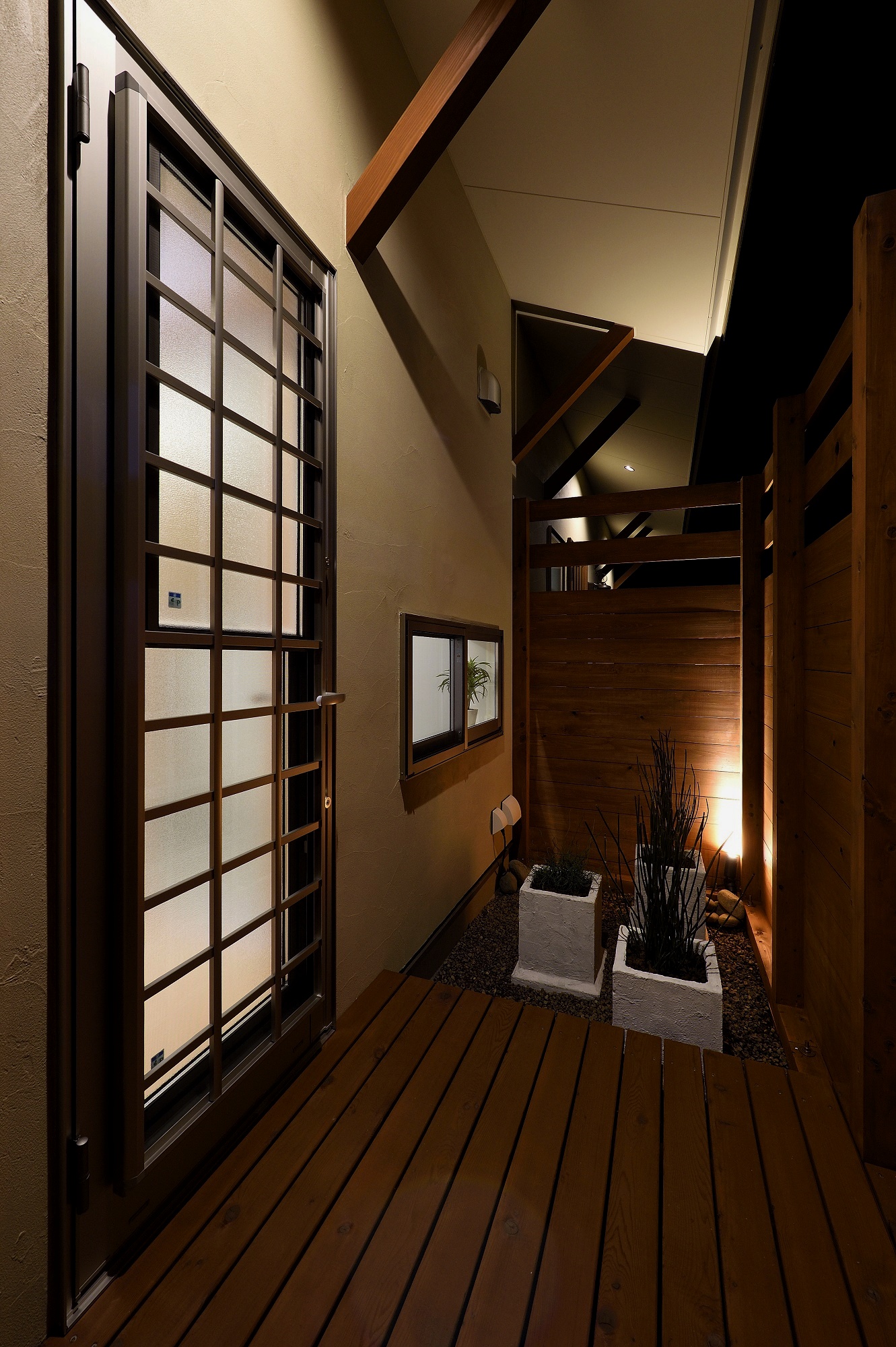 外壁には柔らかな色合いの塗り壁と板張りを採用し、格子とウッドデッキの木の色味まで統一。