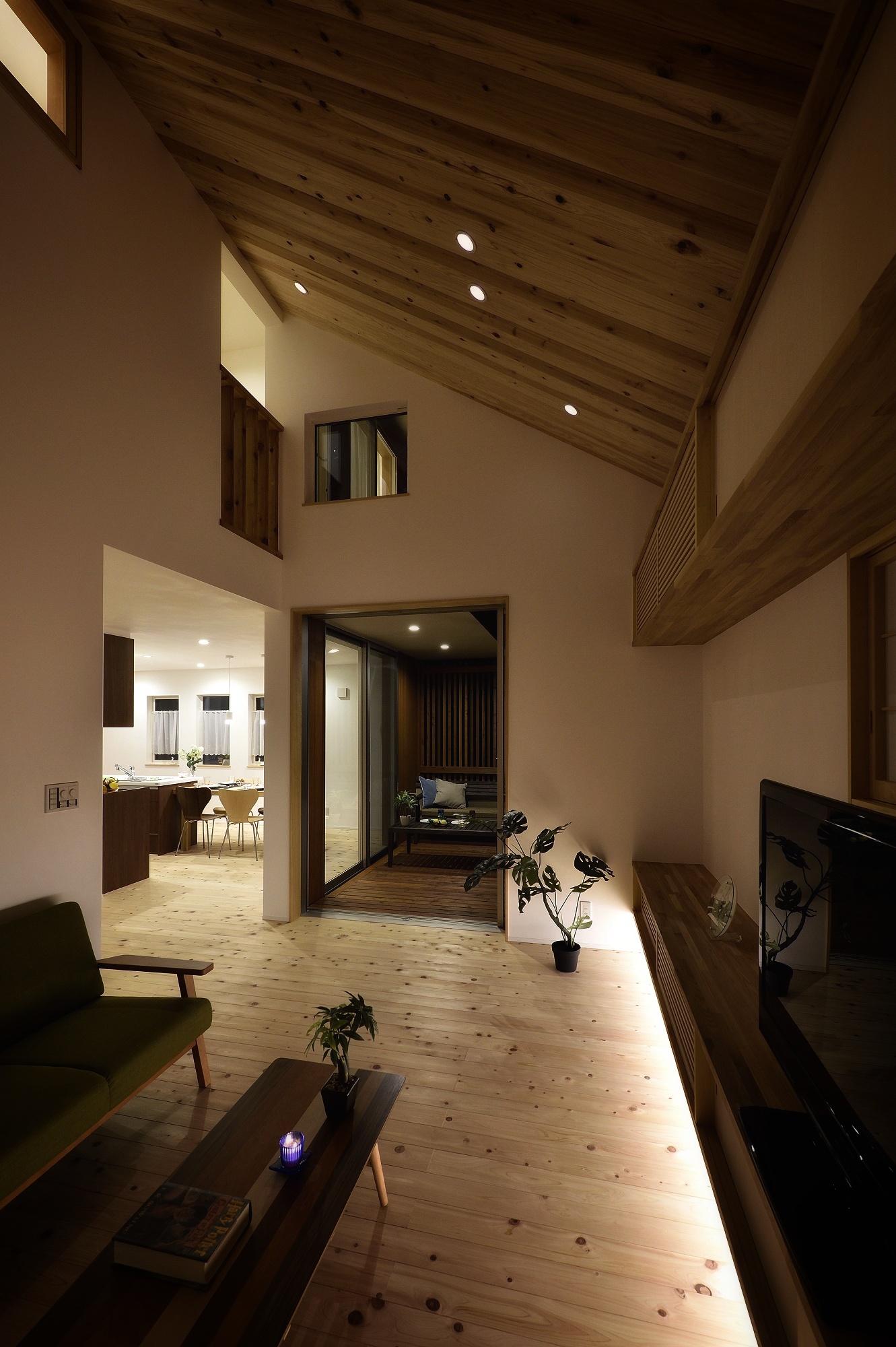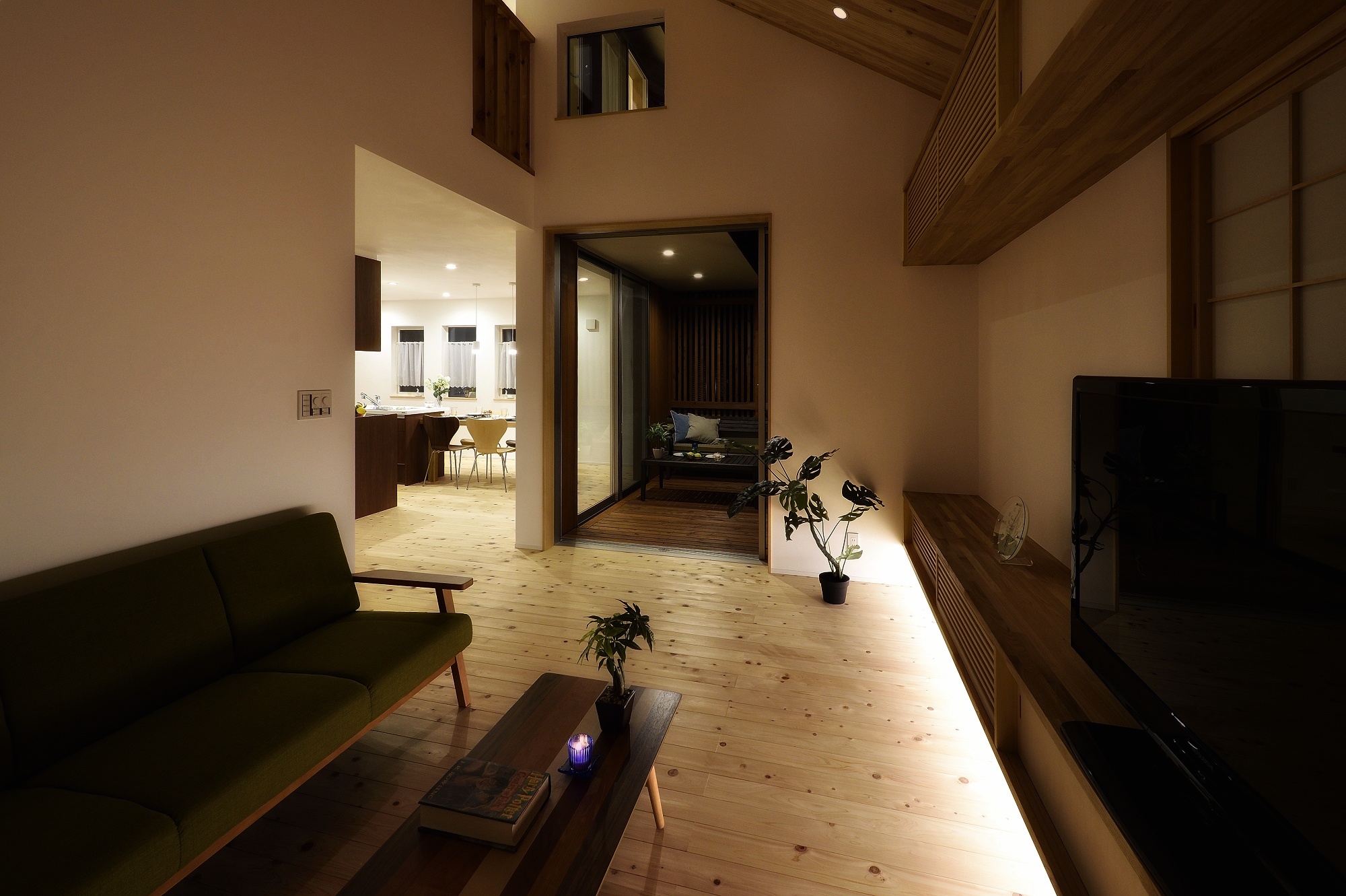 本物の木材を使用したウッドデッキが、LDKをL字型に囲むように広がる設計。